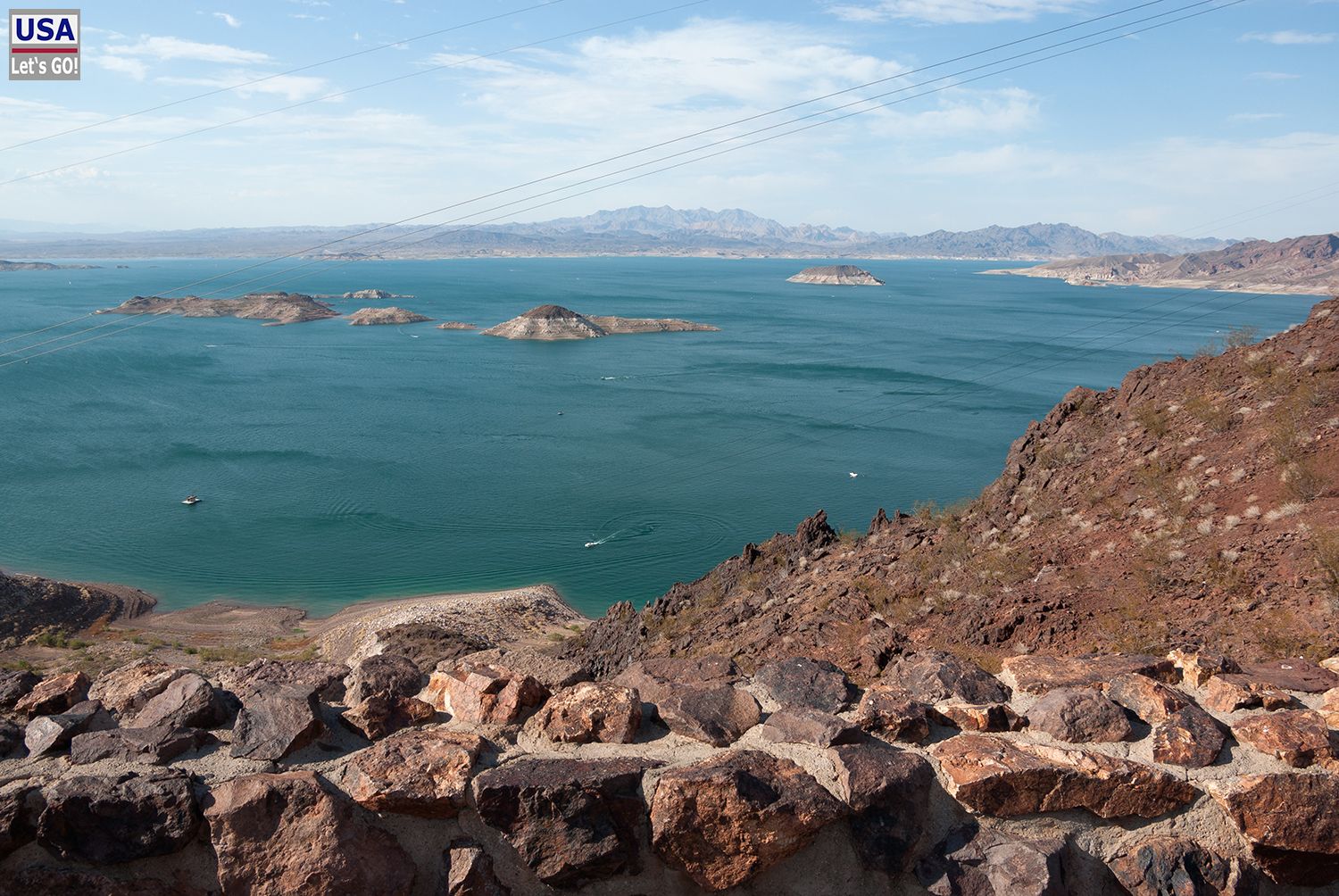 Wir überquerten die Staumauer - der Bypass war damals noch im Bau - und fuhren nördlich davon zu einem schönen viewpoint, von dem aus man auf die im Lake Mead versprengten Inselchen Rock Island und die Boulder Islands blickt.