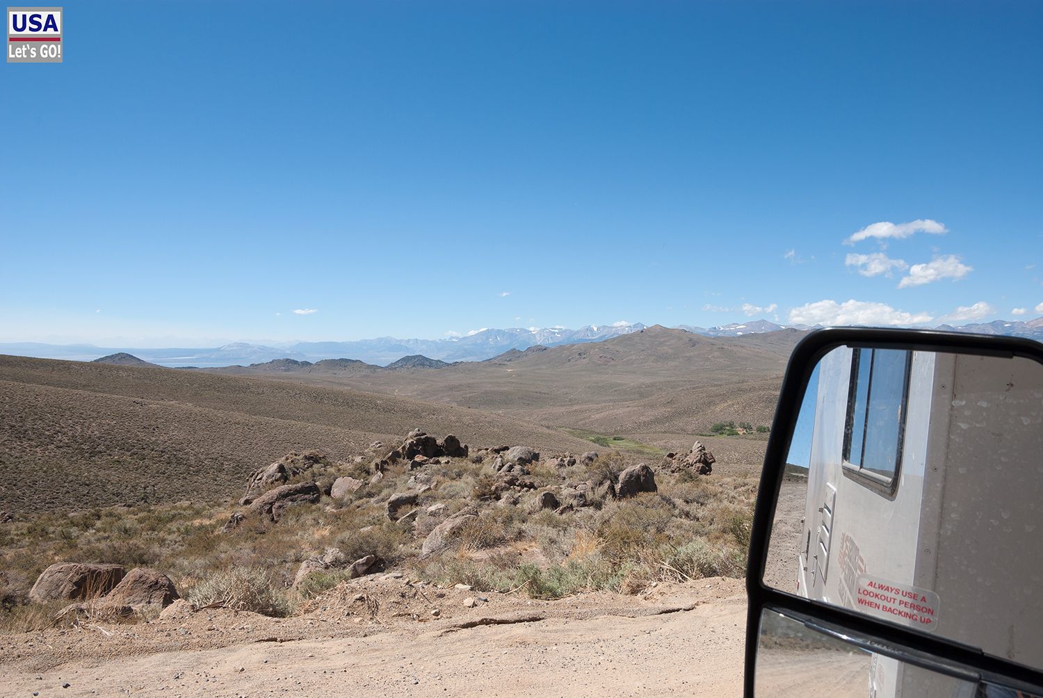 Da wir noch ein mächtiges Programm vor der Brust hatten, fuhren wir rasch weiter auf der wunderschönen CA 395 nach Norden. Die Abzweigung zum Yosemite NP ließen wir für den Moment außen vor. Auch der hübsche Blick zurück auf den Mono Lake ließ uns nicht halten. Stattdessen bogen wir erst nach dem Conway Pass rechts auf eine unbefestigte Straße ab, die uns zum Bodie State Park führen sollte.