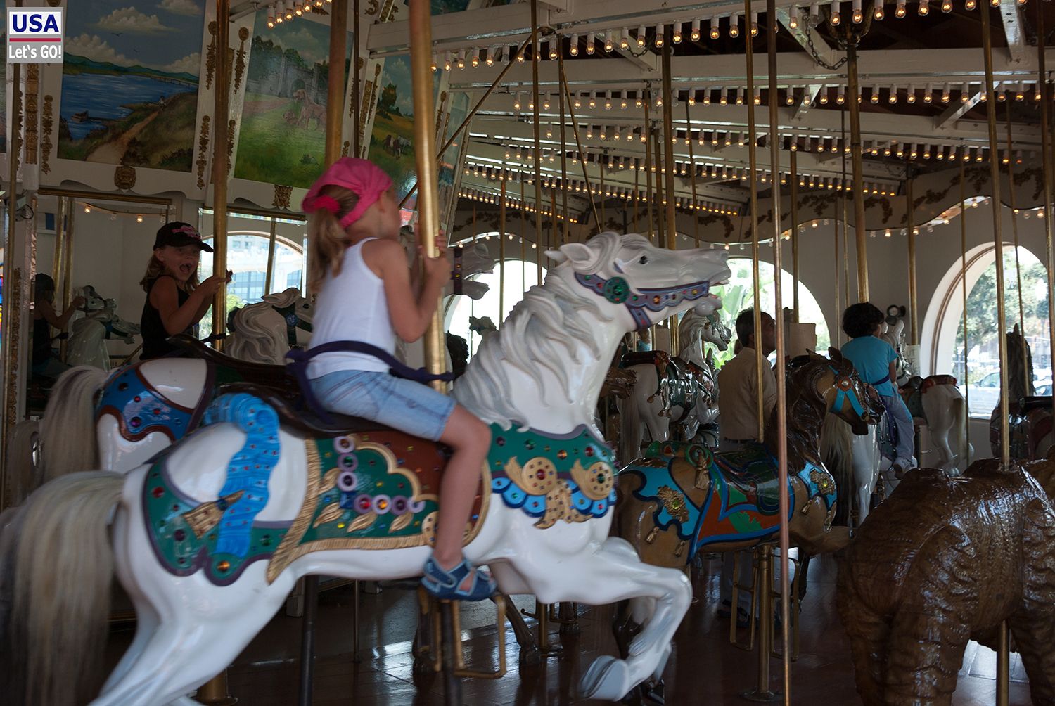 Nach dem Frühstück im Wohnmobil fuhren wir in die City. Seaport Village hieß unsere erste Anlaufstelle. Dort stand das berühmte Pferdekarussell, von dem wir Annalena und Lisa-Marie erzählt hatten. Natürlich spendierten wir eine Runde.