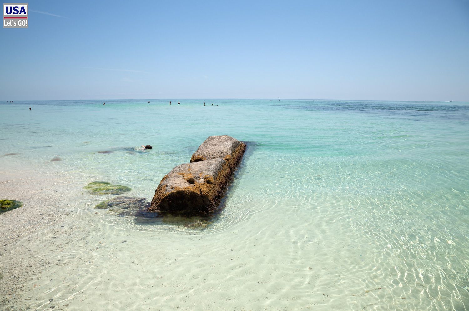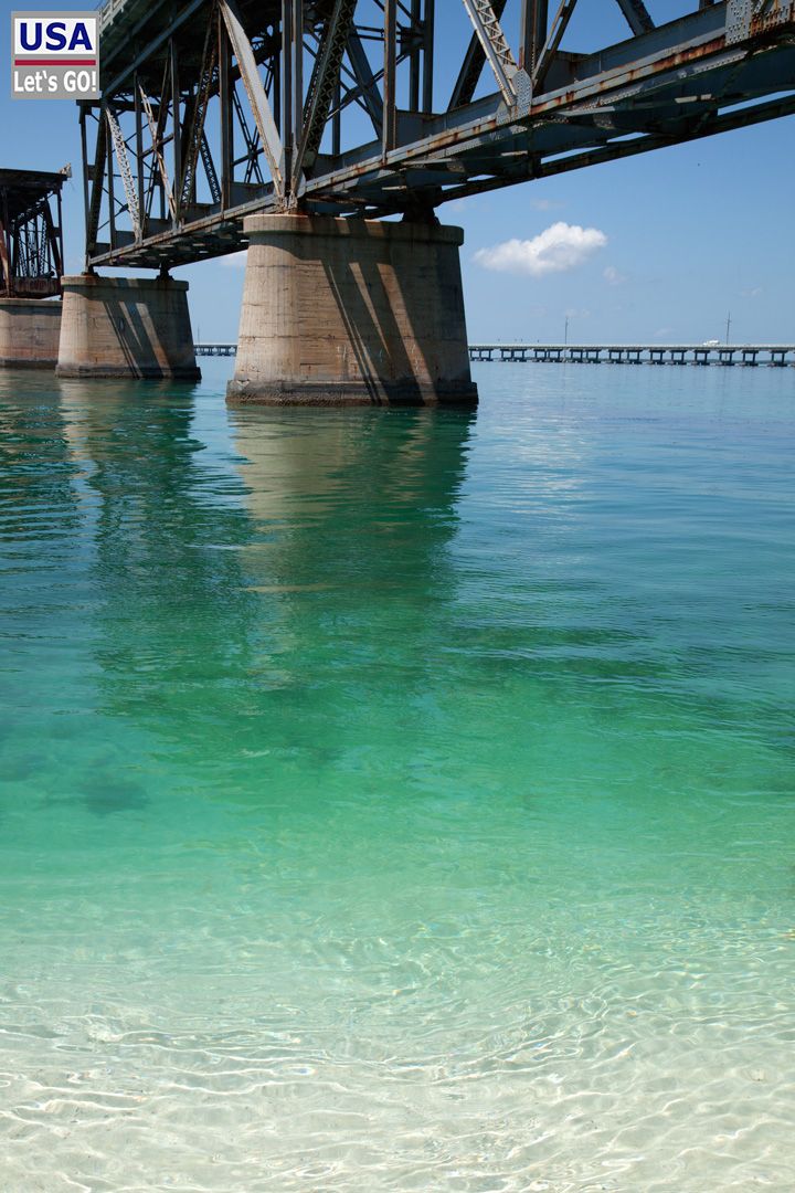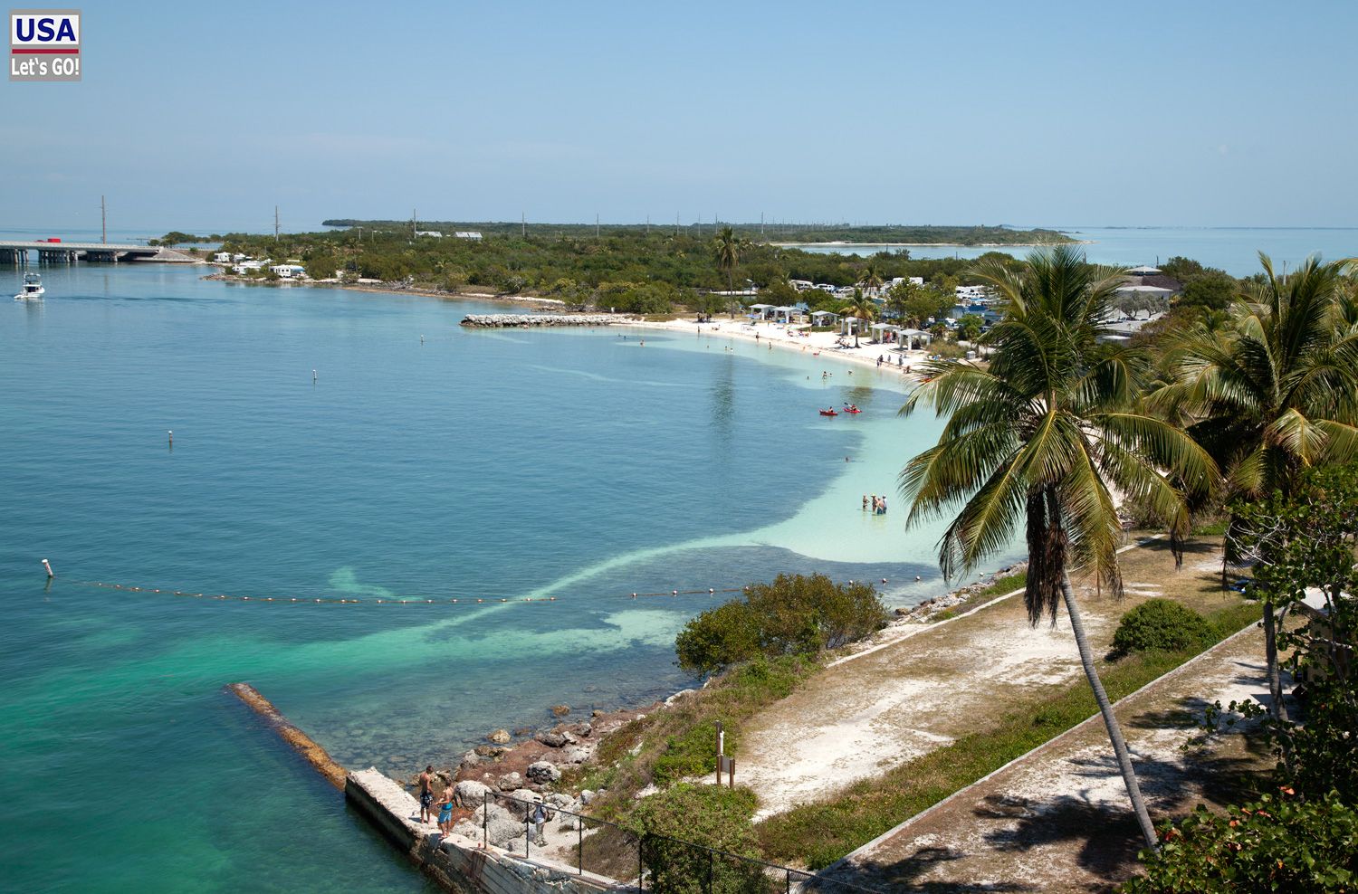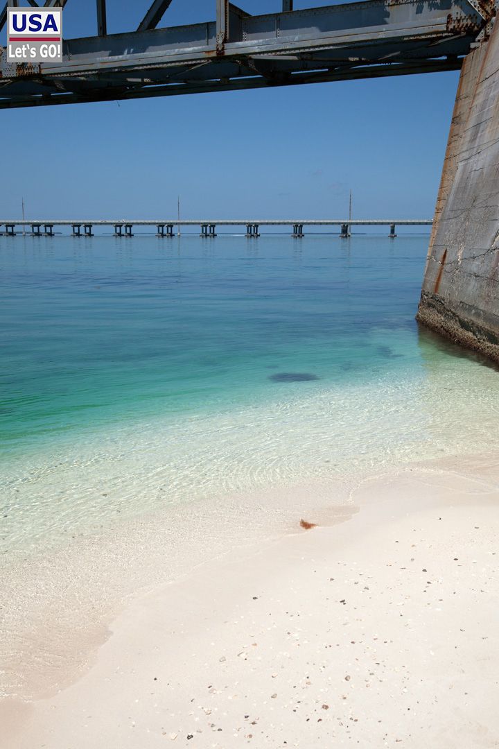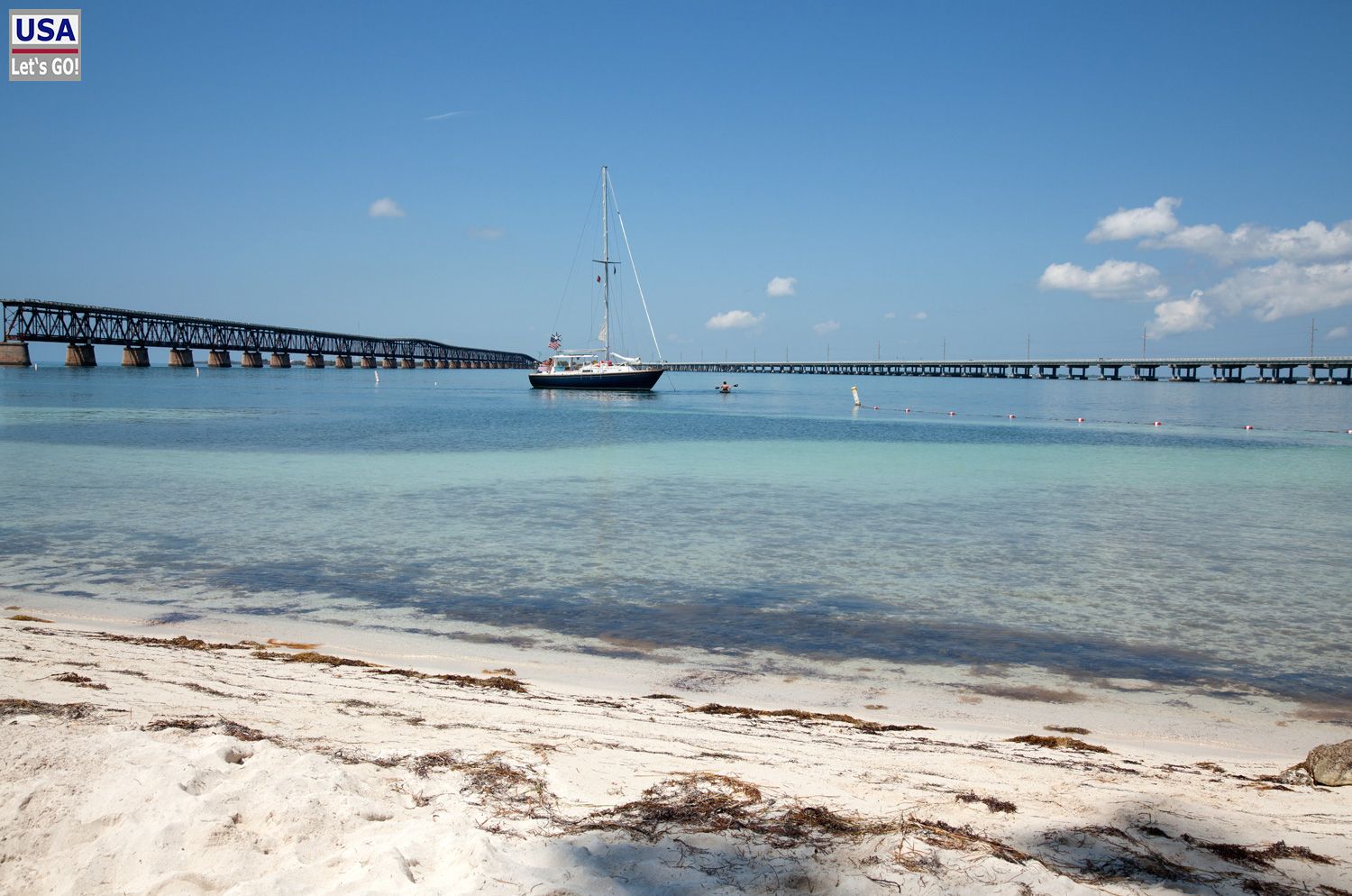 Auf der nördlichen Seite des Parks befindet sich eine schöne Badebucht, dahinter sieht man auf der linken Seite den Overseas Highway und auf der rechten Seite die Überreste der Old Bahia Honda Bridge. DIe Eisenbahnbrücke wurde 1972 teilweise abgerissen.