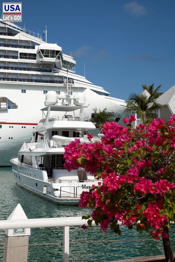 Wir wandern weiter zum Hafen von Key West und sind fasziniert, wie schön dieser gestaltet wurde. Hier liegen große Kreuzfahrtschiffe vor Anker und das Weiß ihrer Rümpfe bildet einen hübschen Kontrast zu den tropischen Pflanzen auf der Hafenpromenade.