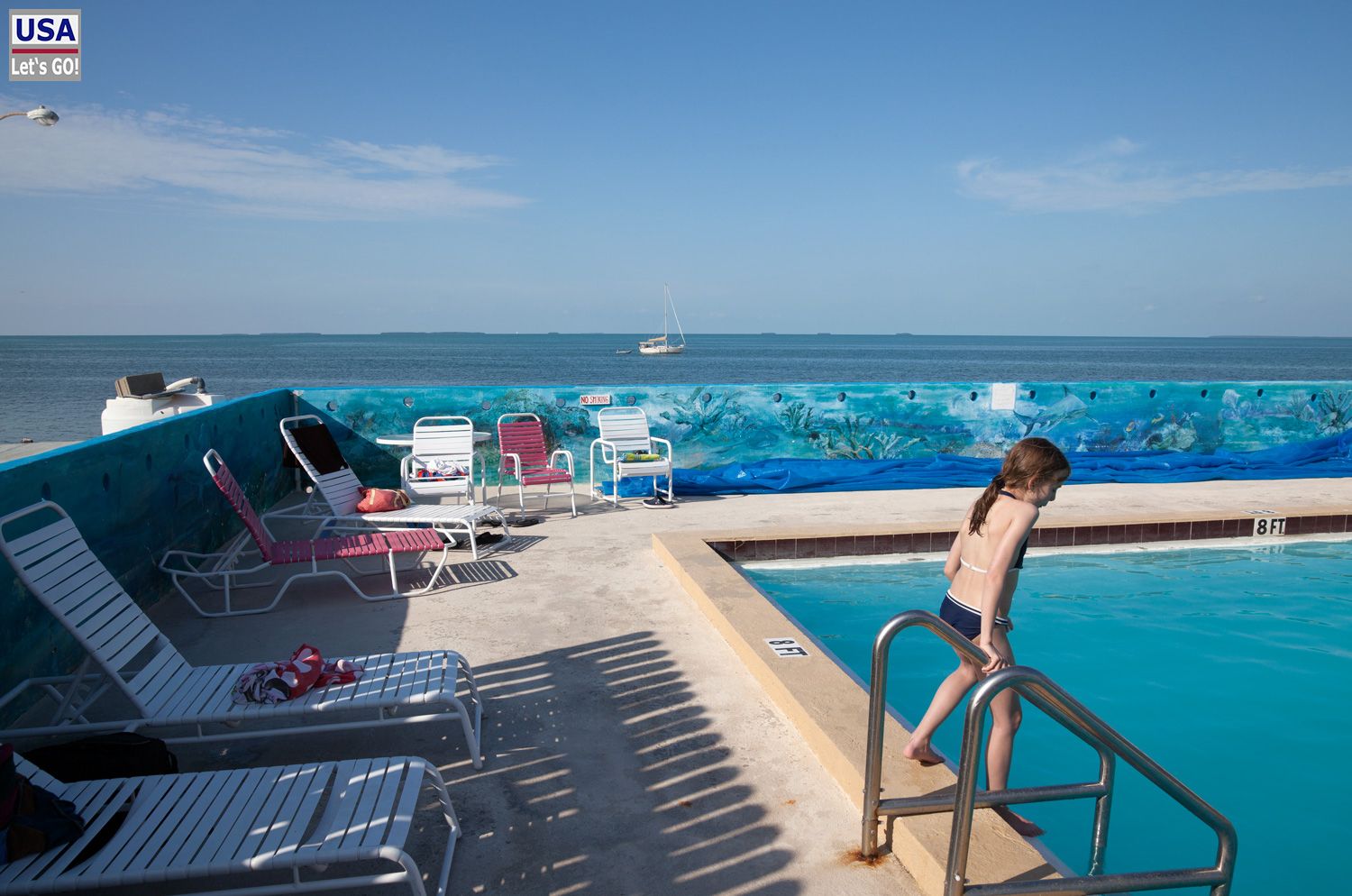 Nachdem der so wichtige Sieg eingefahren ist, müssen wir etwa fünf Minuten zum Pool laufen. Die Füße dampfen zwar noch vom vielen Rennen in Key West, aber das schaffen wir jetzt auch noch. Der Pool ist klasse. Man hat einen tollen Ausblick auf´s Meer.