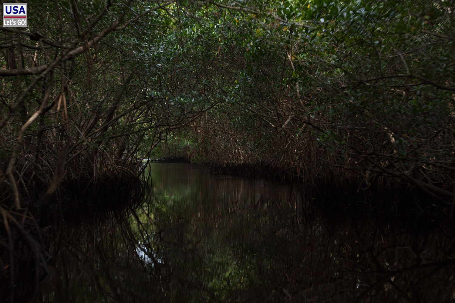 Stellenweise ist es in dem undurchdringlichen Mangroven-Urwald stockdunkel und das am eigentlich helllichten Tag. Was wohl unter Wasser lauert? Reinfallen möchte ich lieber nicht.