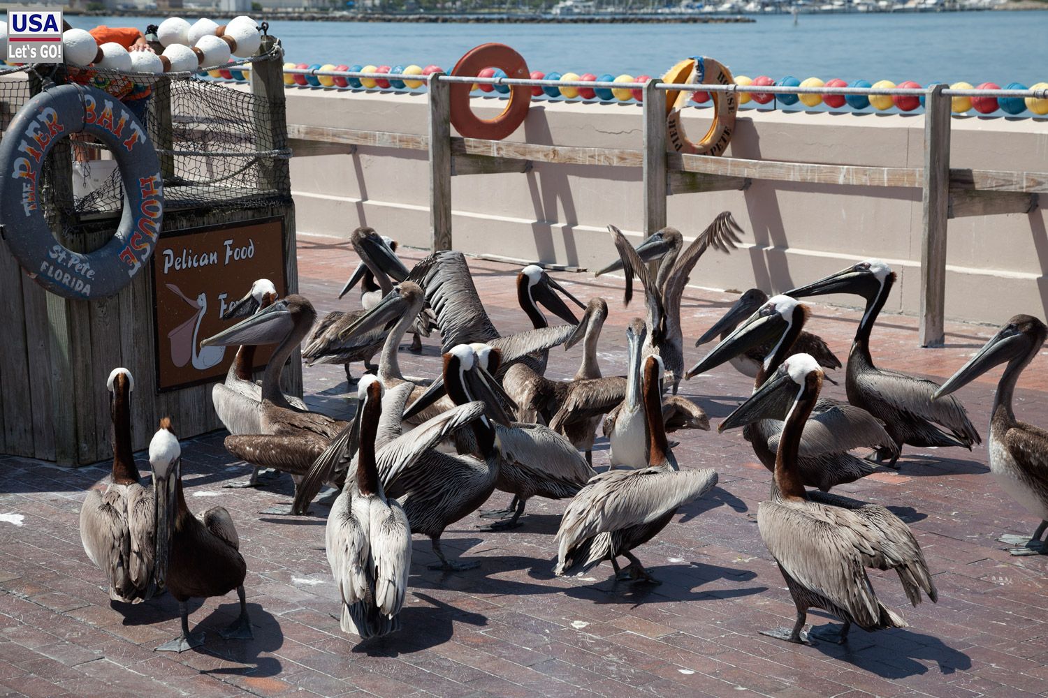 Die allgegenwärtigen Pelikane sind vollkommen außer Rand und Band, als sie - wohl zur Belustigung der Touristen - gefüttert werden. Ob das so eine gute Idee ist?