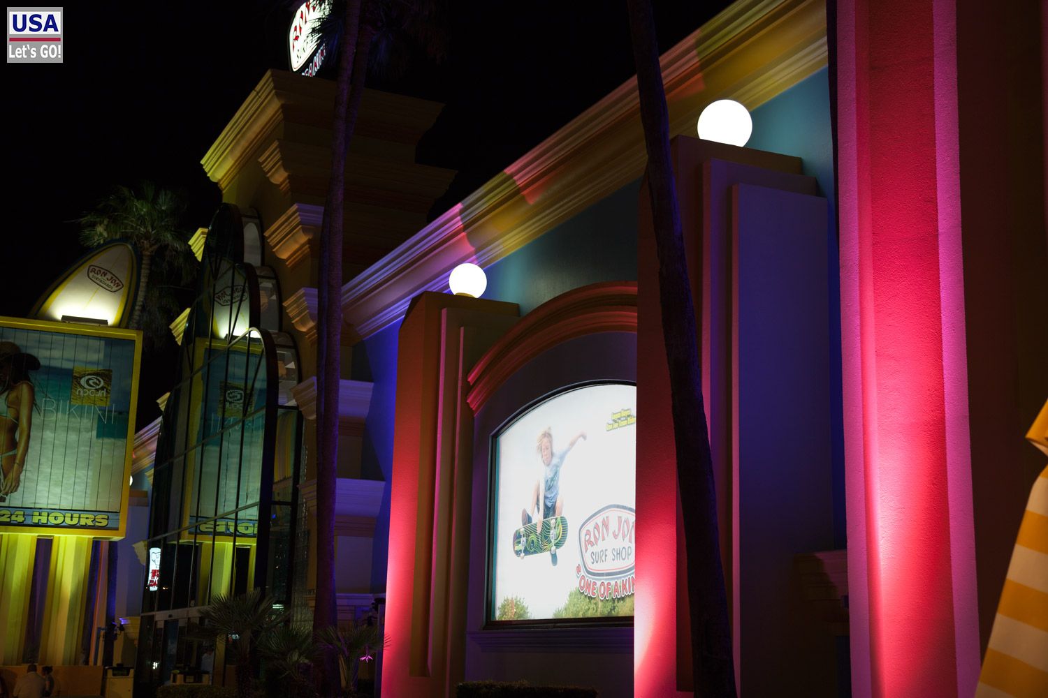 Als es ganz dunkel ist, gehe ich los und mache noch ein paar Fotos von Ron Jon´s und den anderen Läden, die sich in der Nähe befinden.