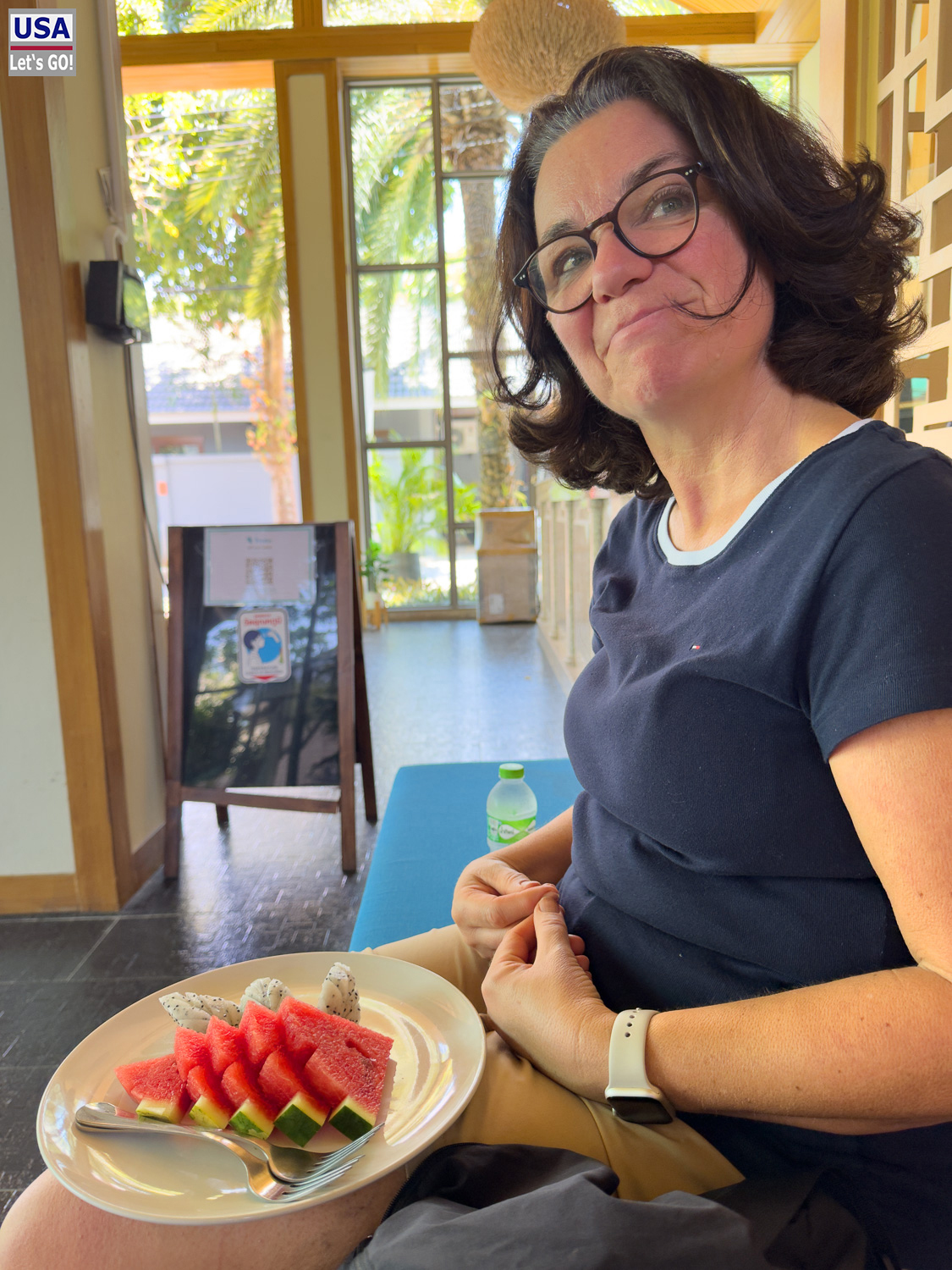 Nach ungefähr 90 Minuten haben wir unsere Unterkunft erreicht: Lady Naya Villas. Das Apartment ist leider noch nicht fertig, wir müssen uns ein wenig gedulden. Die Wartezeit wird uns mit einem Obstteller mit Melone und Passion Fruit versüßt.