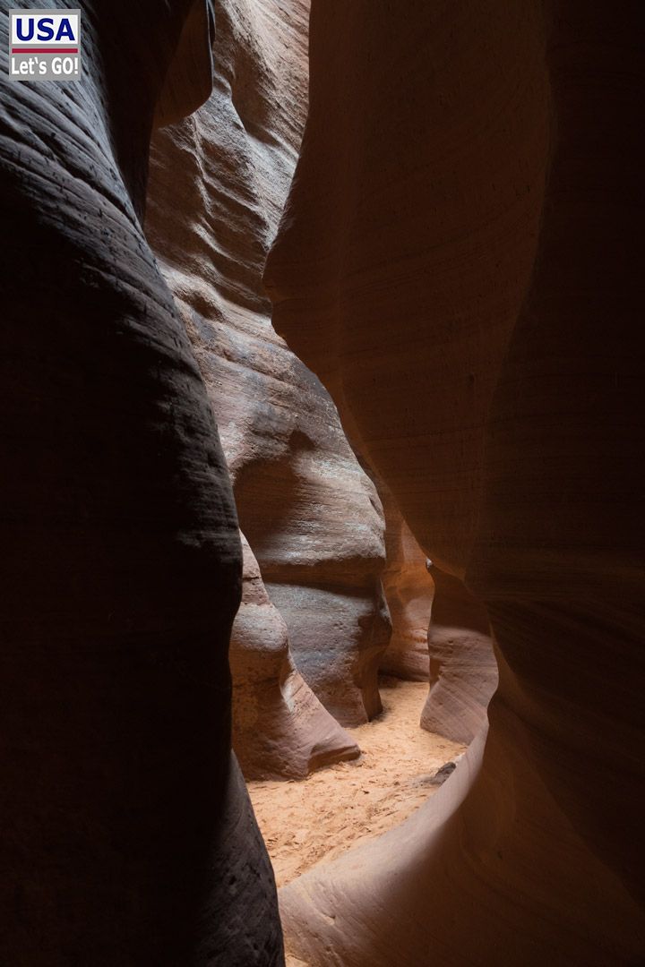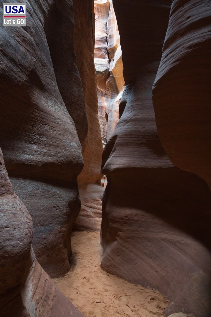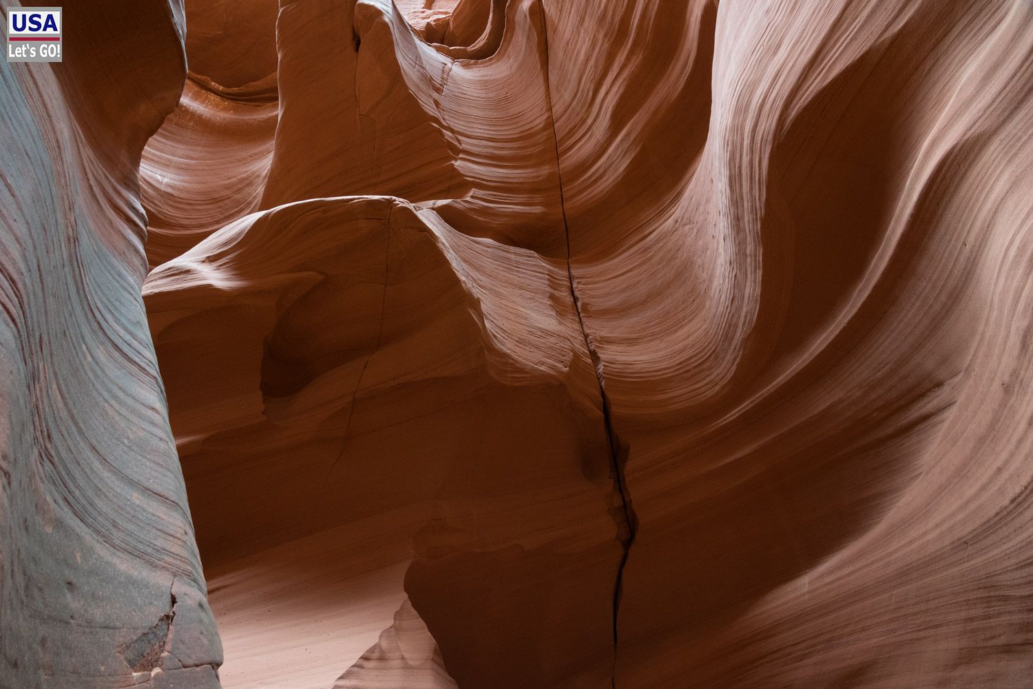 Nachdem die Dame aus der Abteilung Canyon X Navajo Customer Service alle Slot Canyon-Wütigen auf die richtigen Gefährte verteilt hat, geht es los. Über eine ausgewaschene Rumpelpiste fahren wir durch die Prärie und kommen zehn Minuten später an, wo geschätzt 100 Leute schon wieder auf die Rückfahrt warten. Ab hier geht es per pedes weiter und zwar steil bergab. Zurück dürfte im Hochsommer bei 100° F lustig sein, auch wenn schattenspendende Überdachungen aufgebaut sind. Heute, bei ungefähr 3°C natürlich vollkommen unnötig.