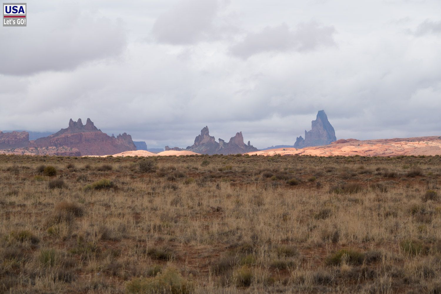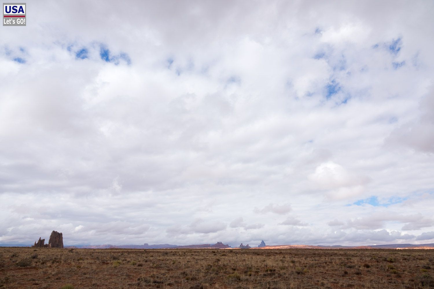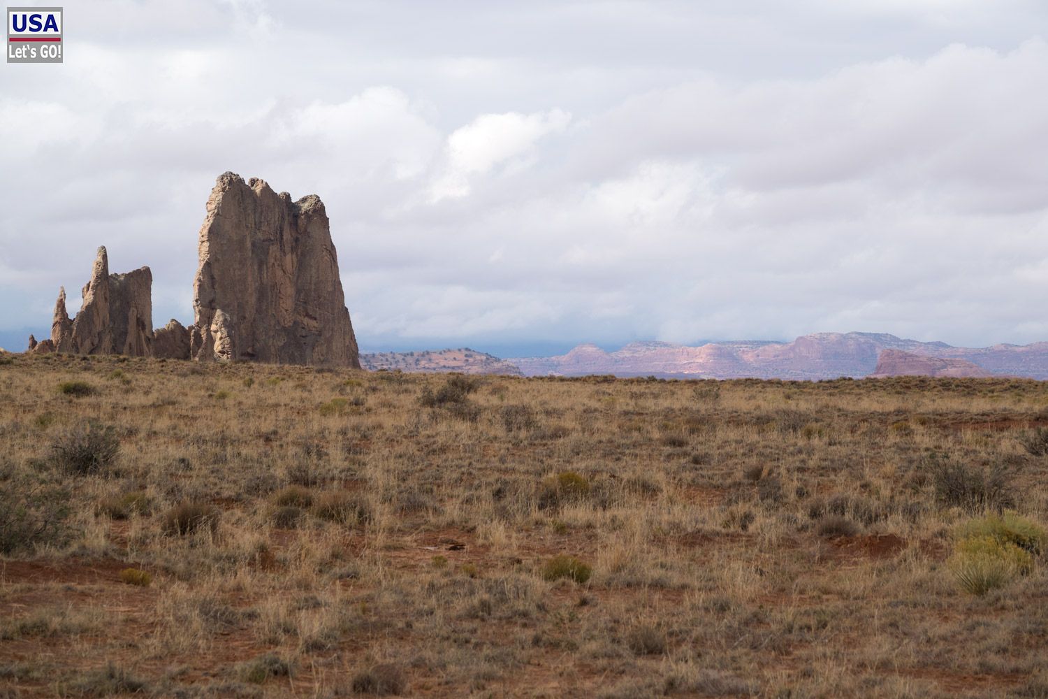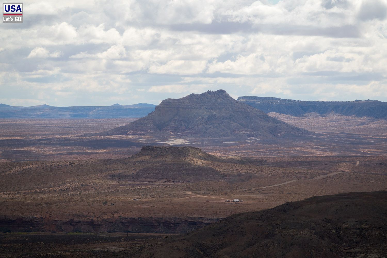 Pappsatt folge ich der AZ 160 weiter nach Osten. An einer Stelle halte ich und mache ein paar Fotos von der Landschaft im Norden. Die Felsen haben Ähnlichkeit mit dem markanten Shiprock, aber dieser liegt in der anderen Richtung.