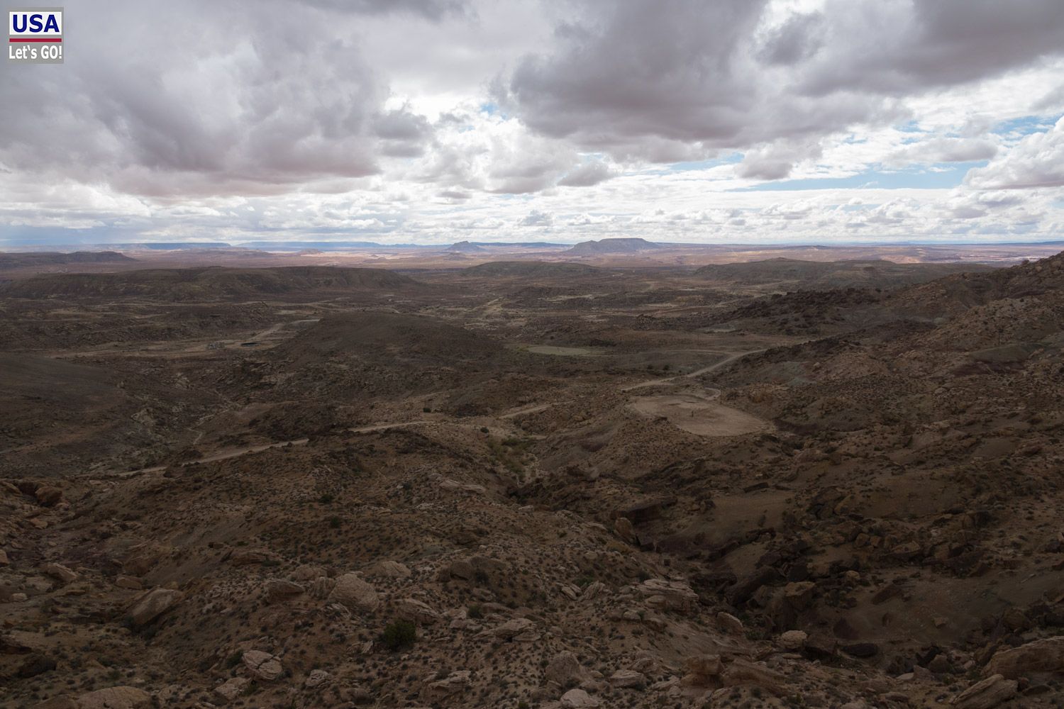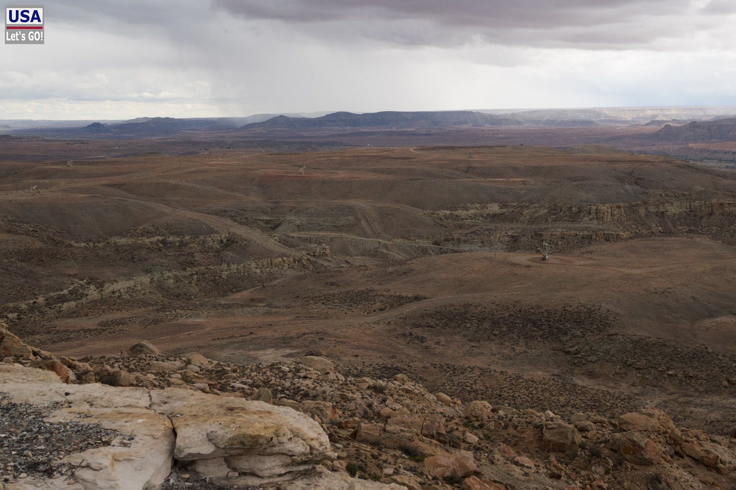 Dicke Regenwolken, wohin ich auch gucke. Vor allem da, wo ich hin will, nämlich nach Nordosten. Montezuma Creek und Aneth sind kleine, verschlafene Nester, durch die ich fahre. Kurz hinter Aneth steigt die Straße an und ich halte bei einem Overlook.