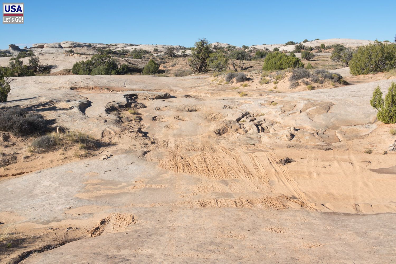 Nach einer Meile geht es wieder links auf ein kleines Slickrock-Plateau. Hier kann man - je nach Fahrzeug - parken, denn im weiteren Verlauf wird es dann richtig ruppig. Nichts für Offroad-Weicheier wie mich.