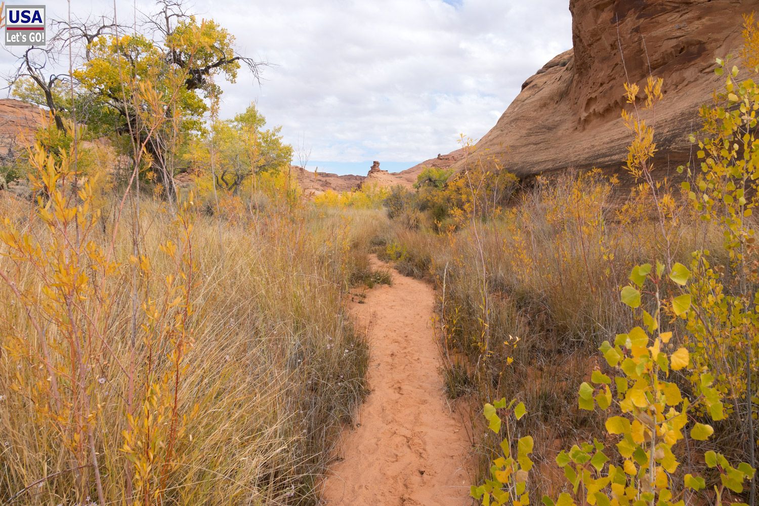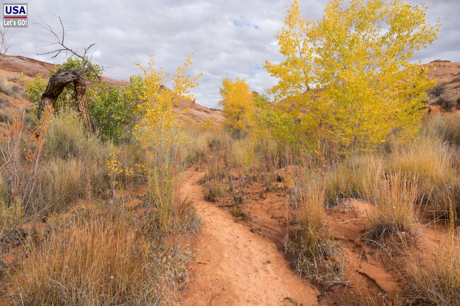 Zunächst geht es durch einen Wash mit wunderschönen hohen Gräsern links und rechts. Auch die in vollem Gelb stehenden Aspen sind ein Hingucker. Ich genieße den angenehmen Spaziergang.