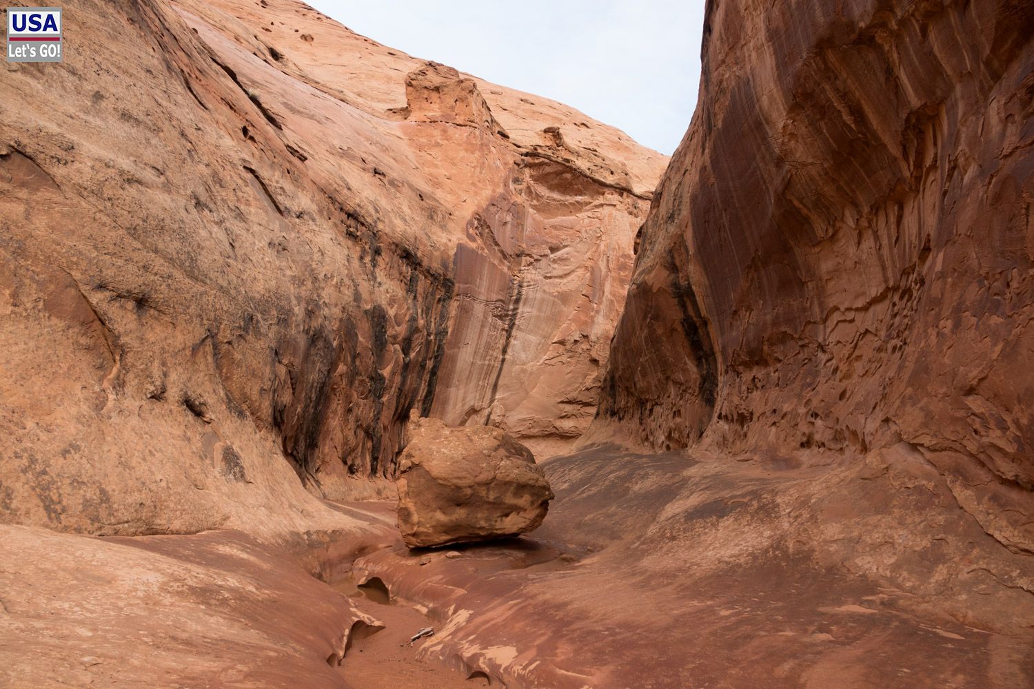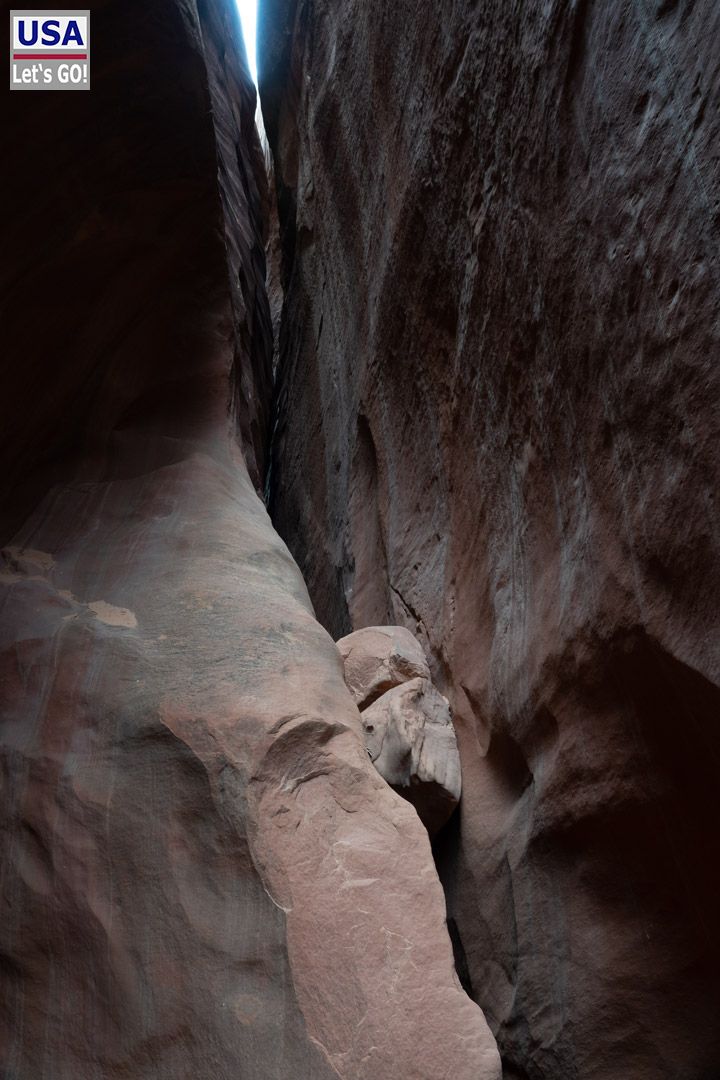 Ich fahre die UT 24 nach Süden. Vorbei am Goblin Valley SP, den ich schon mehrfach besucht habe, geht es am Ende der Straße nach links durch Hanksville. Noch Tanken? Ach, ist noch ein Viertel drin, mache ich auf dem Rückweg. Also geht es weiter nach Süden, bis ich ungefähr bei Milepost 28 die Koordinaten zum Leprechaun Slot Canyon erreiche. Der kleine Parkplatz auf der linken Seite ist eigentlich nicht zu übersehen, wieso habe ich den vor ein paar Jahren nicht gefunden?