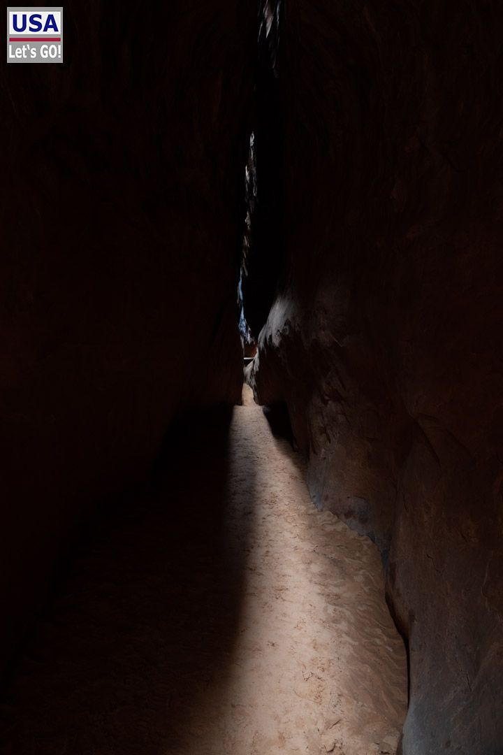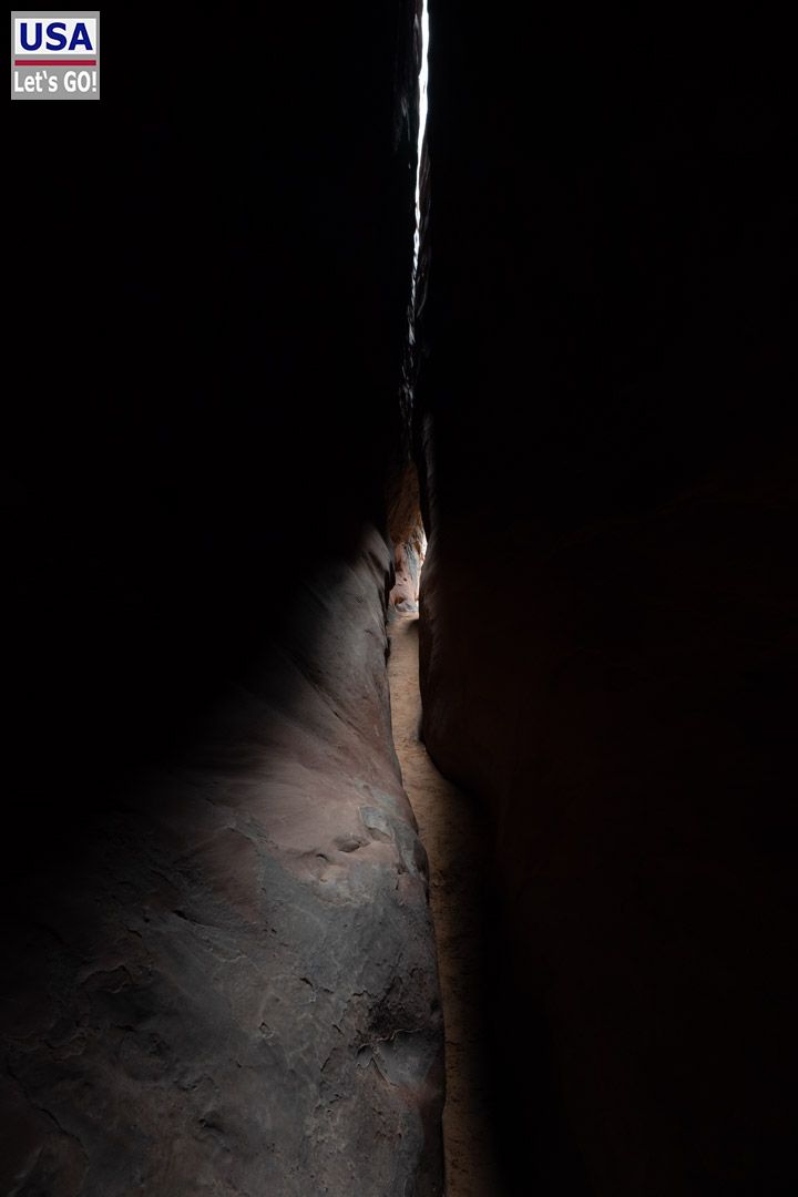 Ich bin schon zwei, drei Minuten unterwegs, als ich noch mal zum Auto zurückkehre. Die Taschenlampe! Im Netz stand, dass es eine stockdunkle (im Sinne von schwarze!) Slot-Passage gäbe. Da will ich dann doch lieber etwas sehen.