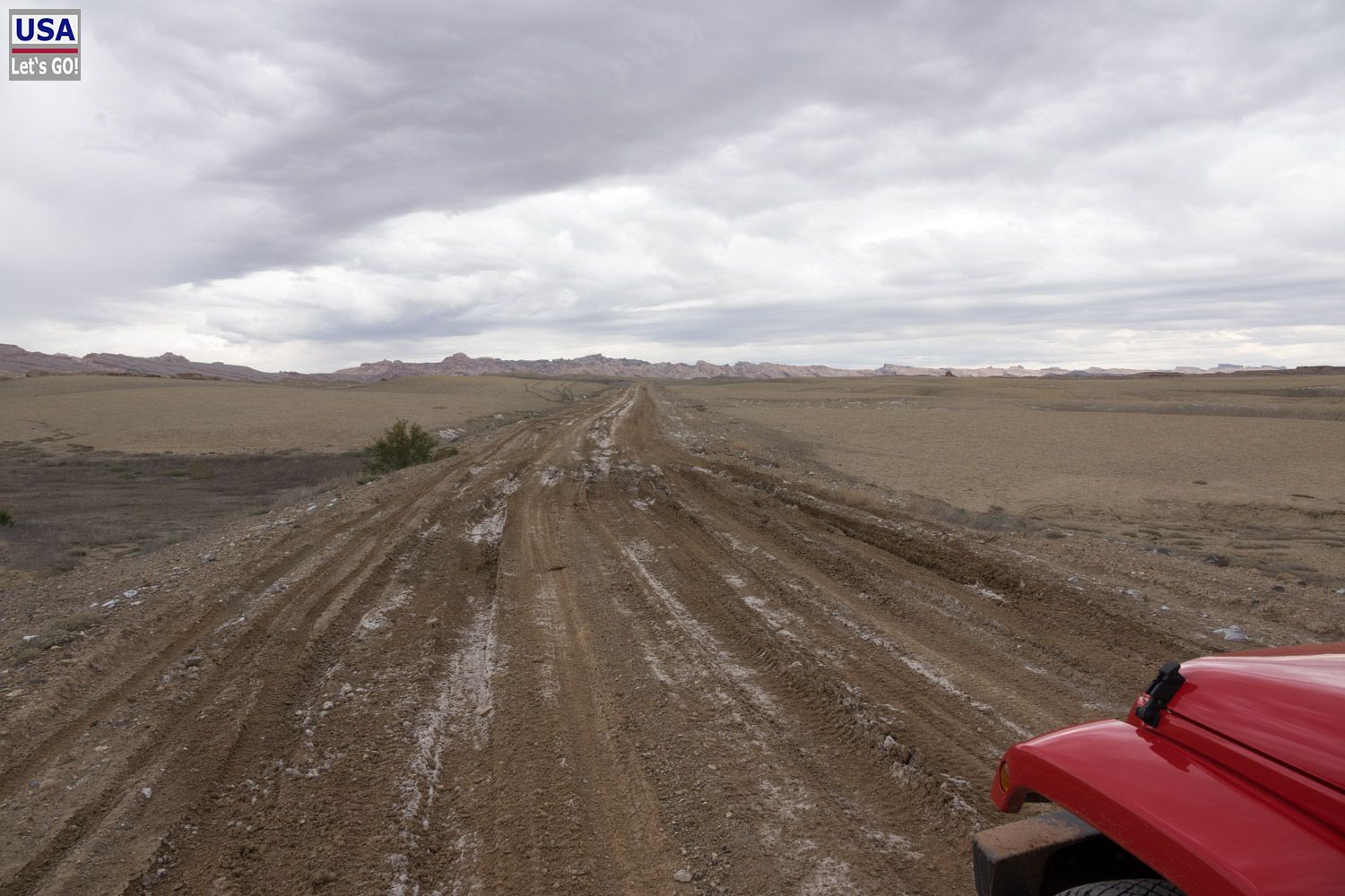 Durch ein Schlammloch, das sich nicht gut umfahren ließ, fahre ich full speed mit 4WD durch. Trotzdem wird der Wagen schnell langsamer und fängt an zu schlingern. Geht aber noch.
