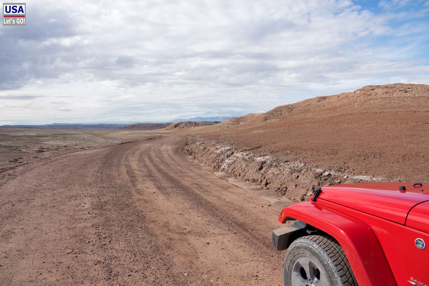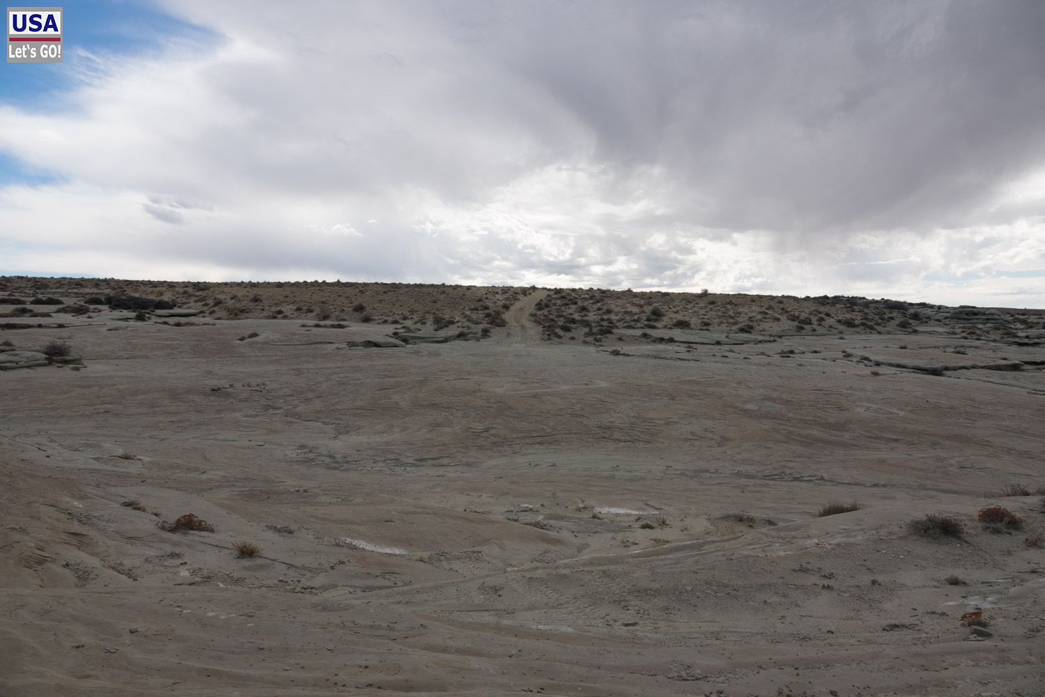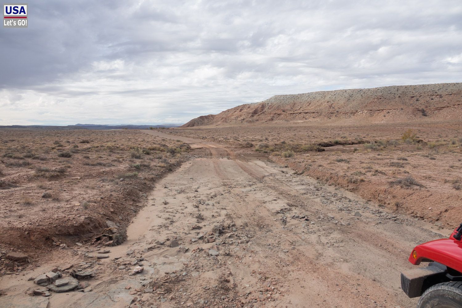Rückzug. Und siehe da: Ich finde die Abzweigung, die 3,1 Meilen südlich der White Rocks nach Osten führt. (Von mir aus gesehen nun rechts, eigentlich links.) Diese ist nicht mehr als ein schmaler Feldweg. Noch 200, vielleicht 300 Meter und ich stelle den Wagen ab. Dahinter kommt eine Felsplatte, über die man fahren könnte, aber mir ist das zu rumpelig.