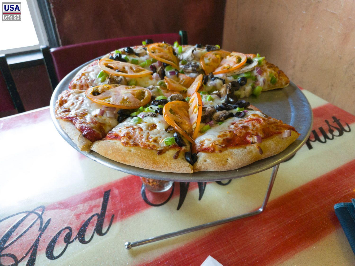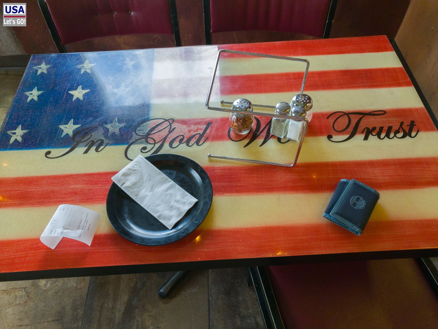 Jetzt geht es in einem Rutsch durch bis Price, die einzige nennenswerte Stadt weit und breit in Central Utah. Dort finde ich eine kleine Pizzeria. Ein Anruf zu Hause und eine leckere Veggie Delight kredenzt auf einem Tisch mit schickem Westerner-Motiv - was will man mehr.