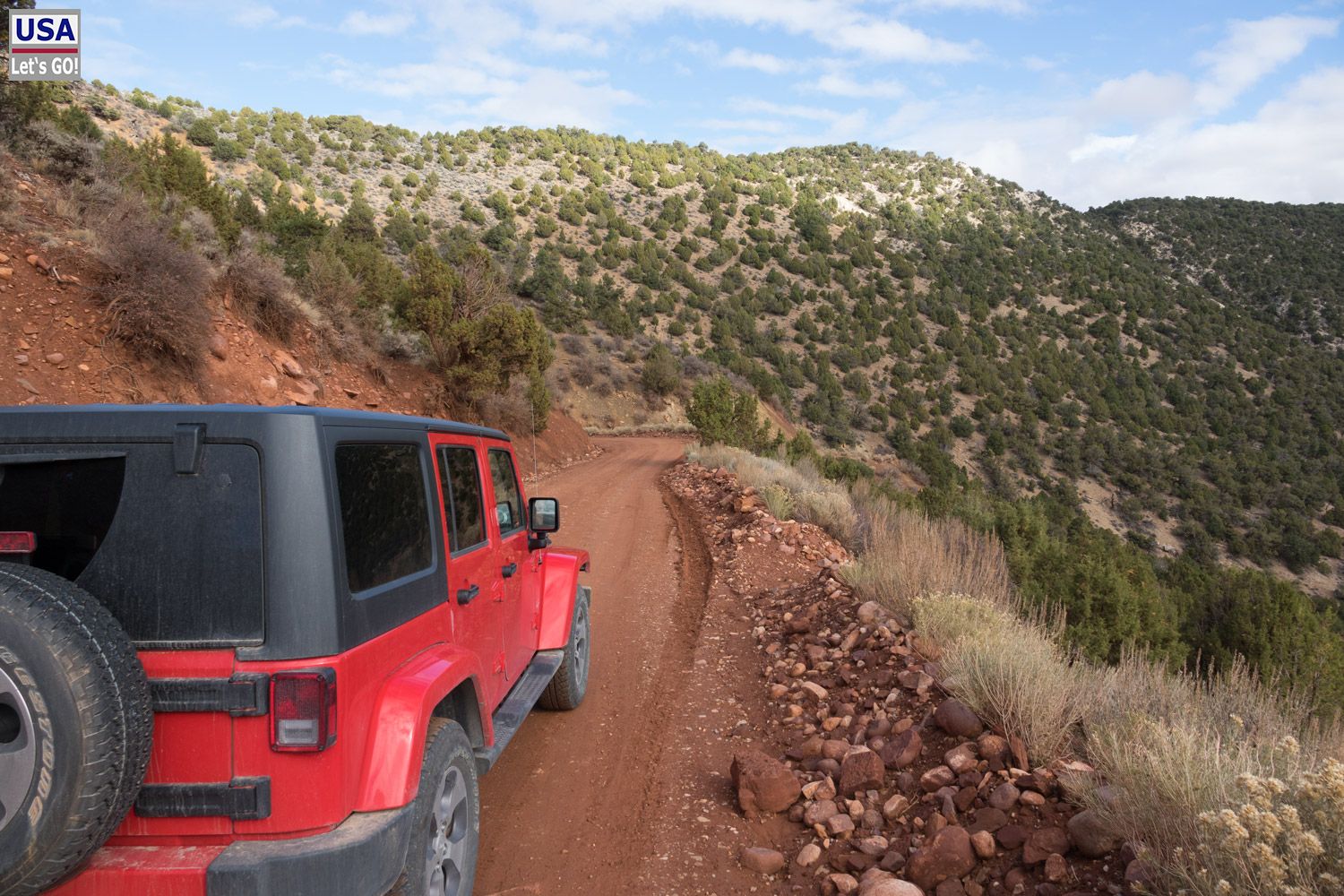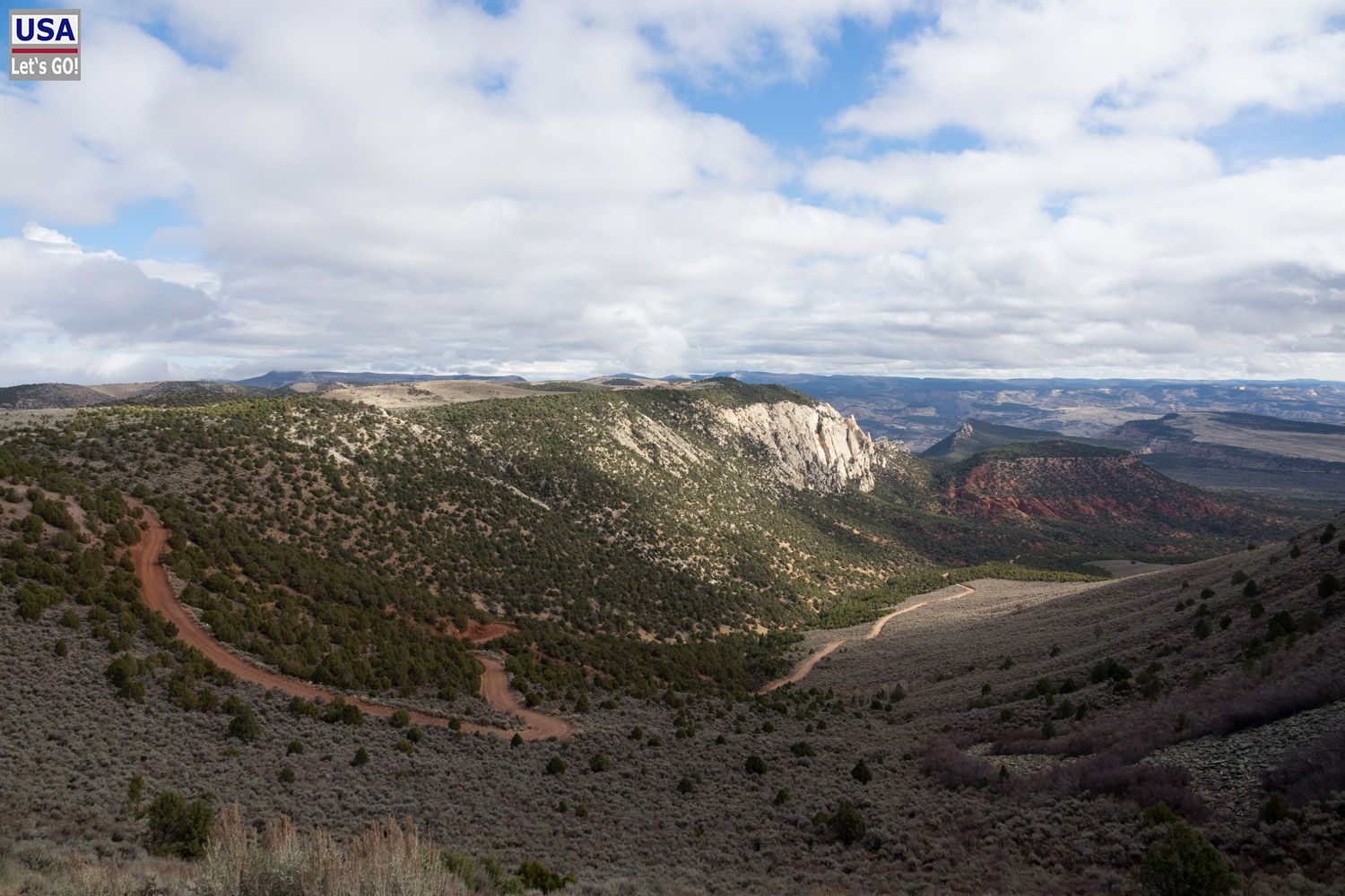 Dann nichts wie los. Zunächst geht es ziemlich steil einen Berg runter, dann kreuzt der eine oder andere harmlose Wash die Piste, die flach ausläuft und durch herrliche prärieartige Landschaft führt.