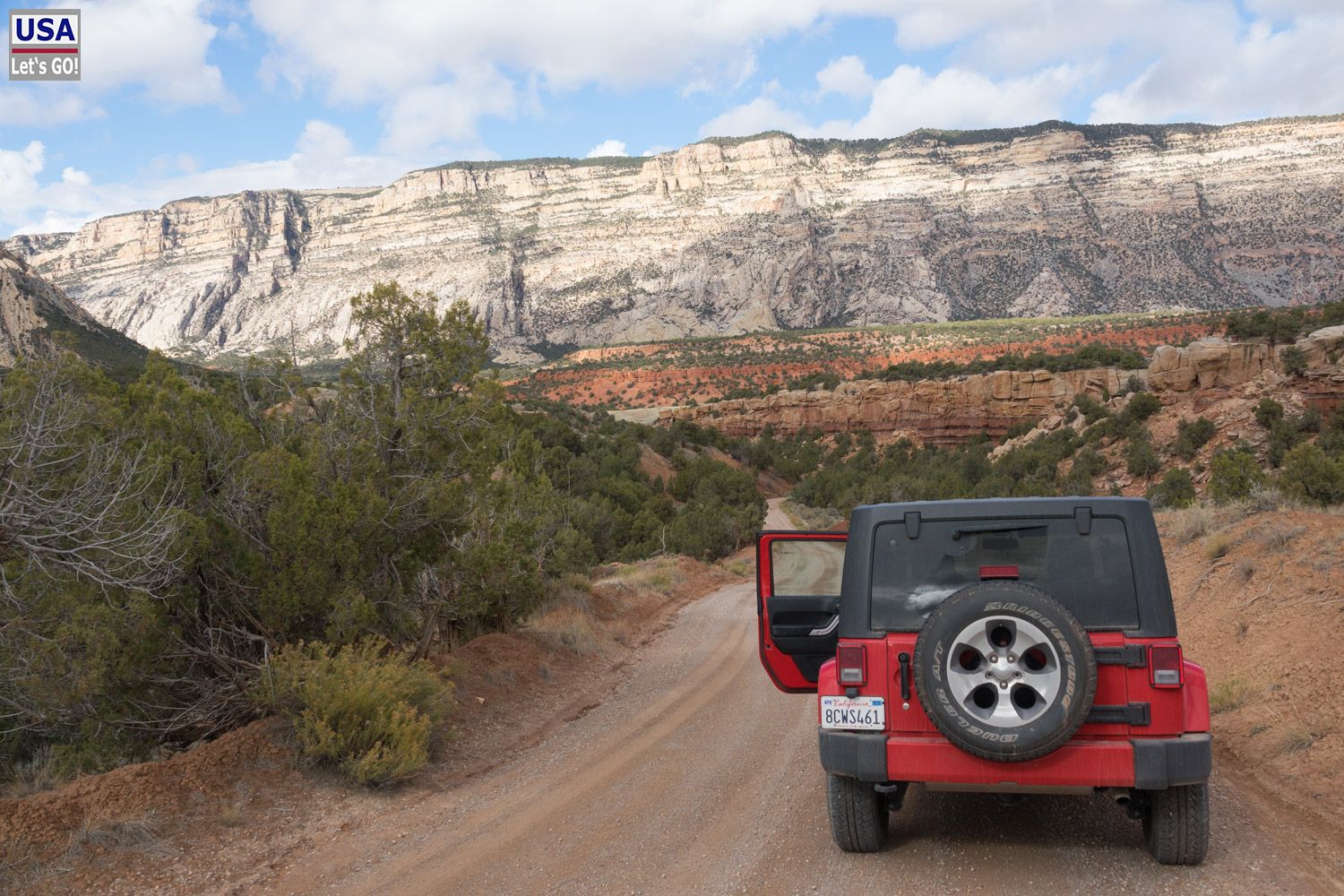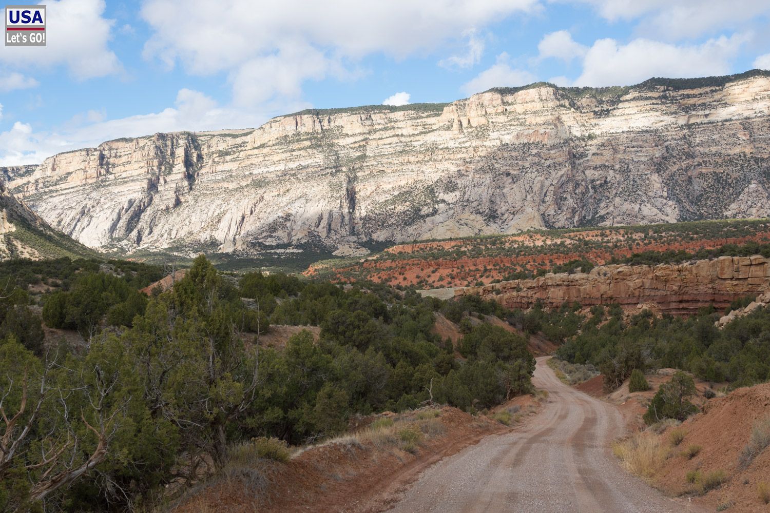Schon bin ich beim Abzweig auf die one way 14 Meilen lange nicht-asphaltierte Straße, die runter zum Green River (Echo Park) führt.
