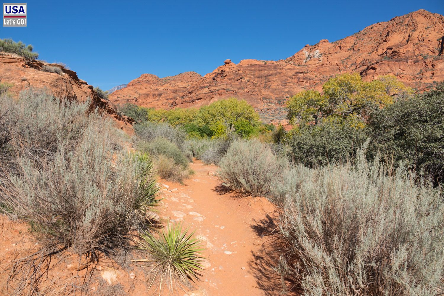 Nachdem der Red Cliffs Nature Trail zunächst ein wenig bergauf und bergab führt, kommt man zum Bett des Quail Creek mit senkrecht aufragenden roten Felswänden. Die roten Felswände - Red Cliffs eben - sind beeindruckend.