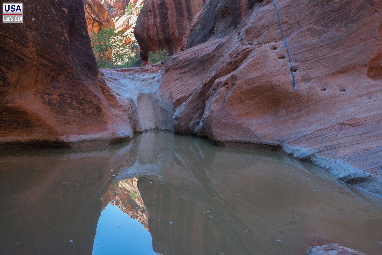 An dem blauen Seil hält man sich fest, um über die Moki Steps auf die andere Seite zu kommen, wo der Trail weitergeht, und nicht im Wasser zu landen.